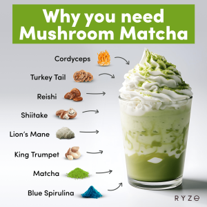 RYZE Mushroom Matcha features 6 adaptogenic mushrooms and antioxidants from organic Matcha to support gut health. improve mood. boost immunity and long lasting energy.