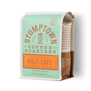 A satisfying half-caff blend of regular Latin American and Indonesian coffees blended with Swiss Water Process decaffeinated coffees with notes of rich dark chocolate. sweet dried fruit. and dense brown sugar.