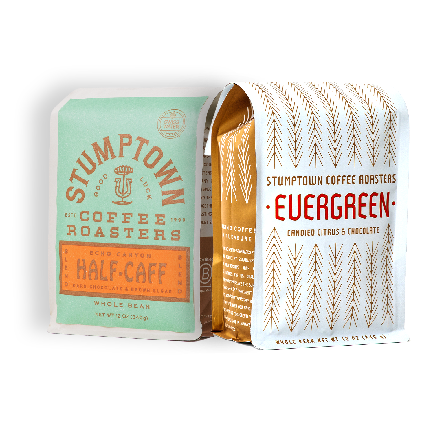 This duo can handle the lively conversations and the after-dessert talk with one 12 oz bag of our limited Evergreen Blend and one bag of Echo Canyon Half-Caff Blend. which walks on the lighter side of caffeine.